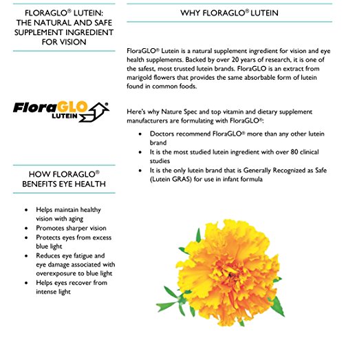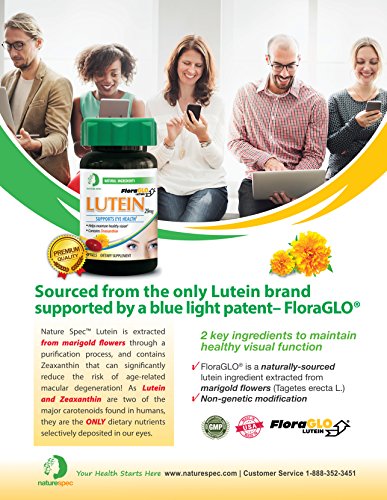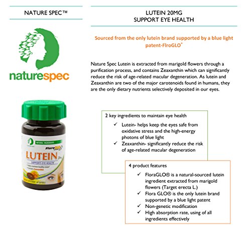Studio : NATURE SPEC Publisher : NATURE SPEC Binding : Health and Beauty Product Description Nature SpecTM Lutein is extracted from marigold flowers through a purification process, and contains Zeaxanthin that can significantly reduce the risk of age-related macular degeneration! As Lutein and Zeaxanthin are two of the major carotenoids found in humans, they are the ONLY dietary nutrients selectively deposited in our eyes. PREMIUM LUTEIN VISION SUPPORT: Our Lutein is formulated to help you maintain healthy vision. Lutein is a pigment found in the macula. They work like an internal eye filter to prevent damage from blue light. PATENT AND CLINICALLY RESEARCHED FORMULA: Our Lutein 20 mg contains the best patent Lutein Flora Glo to ensure your ocular supplementation needs properly met. VITAMINS FOR AGE-RELATED EYE DEGENERATION: Studies have shown micronutrient supplementation to reduce the risk of ocular deterioration. Our Lutein may promote the healthy central vision and overall ocular health in men and women. Each of our soft gels contains 20 mg of Lutein (found in natural safflower oil) to promote healthy vision. Use our Lutein supplements to promote overall eye health. PROMOTES HEALTHY VISION IN MEN WOMEN: Both men and woman can benefit from our Lutein 20 mg Eye Support soft gels. Studies have found that higher levels of Lutein can contribute to greater levels of optical density. Lutein also helps boost ocular health and reduce the occurrence of age-related degeneration. Buy for yourself or as a surprise gift for an elderly parent. 0