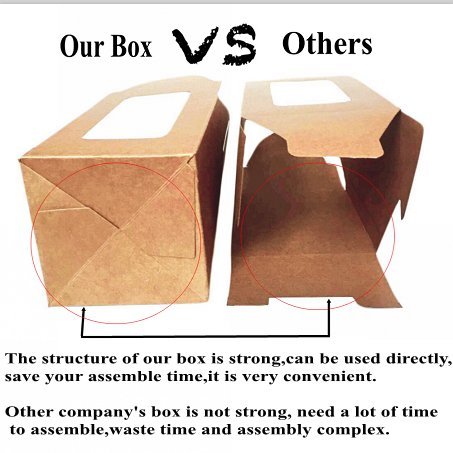 - Save Assemble Time: As shown in the picture,the bottom structure of our box is strong,the bottom doesn't need assembling,which can save your assemble time. This is very important,unlike other similar products on the market,if client buy a cake,you need lots time assembling box, they will feel bad.which is complicated,maybe what's the worst is that you don't know how to assemble it and it is a waste of time and money. However if you buy our boxes, you will not have toworry about it.
