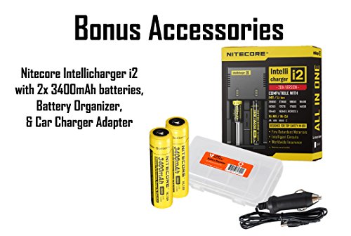 - Bundle includes 2 x 3400 mAh 18650 rechargeable batteries, i2 Two Channel Smart Charger, Car Charger Adapter, and Lumentac Battery Organizer. Manufacturer package includes P12GT, holster, clip, tactical ring, lanyard, switch cover, and o-rig