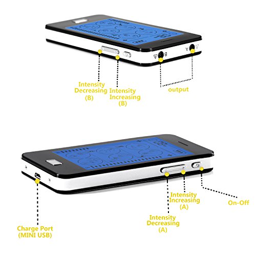- FEATURES : 24 preprogramed massage modes with Touch Screen. Tapping, Acupuncture, Deep Tissue, Foot, Cupping, Combo. Adjustable 20 to 60 minutes timer by using " T " button. Rechargeable internal lithium battery. Up to 20 hours continues use. A-B Output will allow you to use it as 2 separate users.