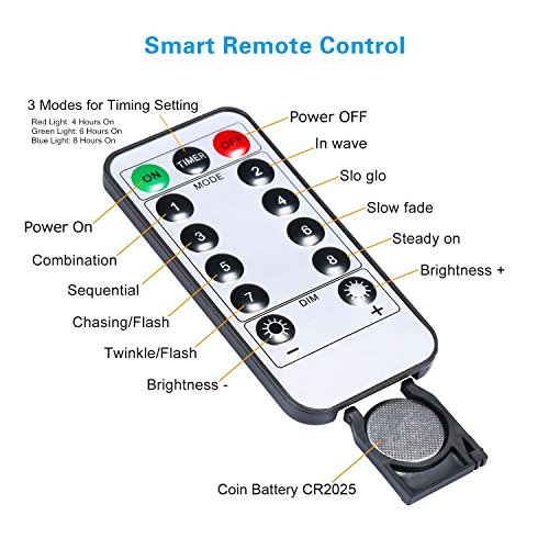 Timer and Dimmable with Remote: Use the 13 keys remote control for easily operation. You can also adjust the brightness or switch between 8 lighting modes: Combination, In wave, Sequential, Slo glo, Chasing/Flash, Slow fade, Twinkle/Flash, Steady On.