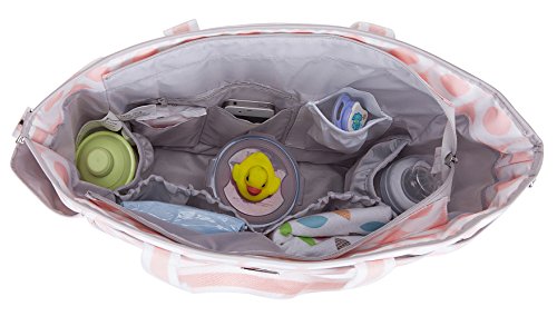 Multi pocket design 9 pocket Interior Construction: 1 main compartment with secure zipper closure, 1 zip pocket for cards, 2 slip pockets, 1 pacifier pouch, 2 side insulated bottle pockets and 2 elasticized pockets.