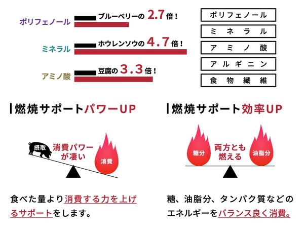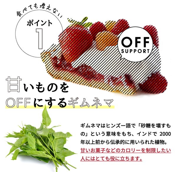 還元麦芽糖水飴、デキストリン、植物発酵エキス末、 ギムネマエキス末、植物発酵食品、白インゲン豆抽出物、ゼラニウムディエルシアナム抽出物、クラチャイダム、キトサン、二酸化ケイ素、ステアリン酸Ca、
