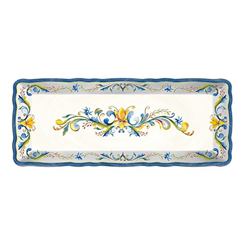 Studio : LeCadeaux Publisher : LeCadeaux Product Description One melamine baguette tray measuring 15 by 6 inches in Floral Harvest from Le Cadeaux. Melamine is extremely durable and lightweight dinnerware that is dishwasher safe. Le Cadeaux makes the best quality melamine with beautiful, vivid designs from the best raw materials possible. However, melamine is not microwave safe. We recommend buying one piece if you have never seen these before, to ensure you like the pattern, weight, color and feel. Then you can order more when you are sure of the pattern you want. Color differences are normal since the pattern is applied to the surface, and cannot ever be fully uniform. 0