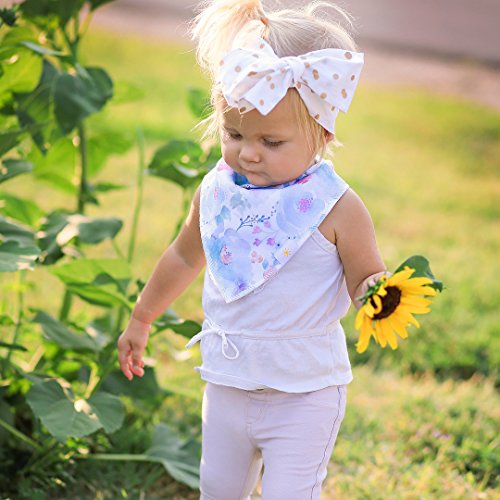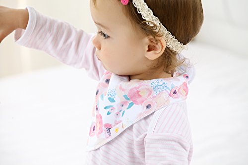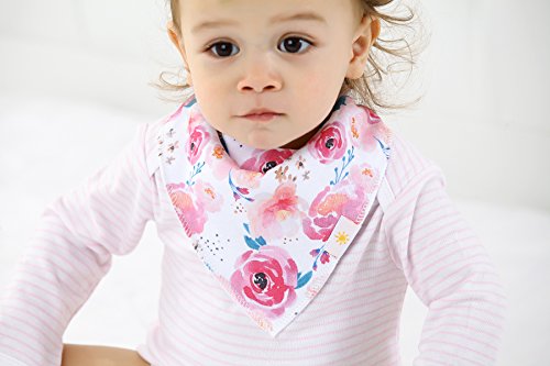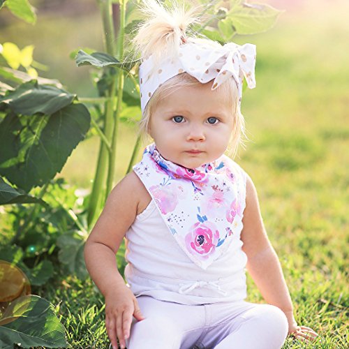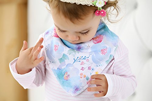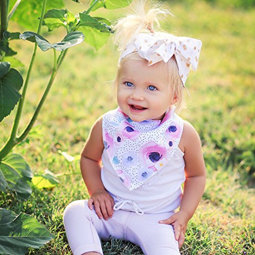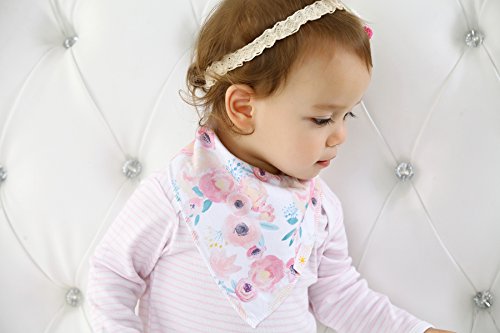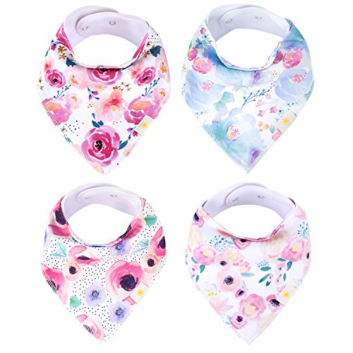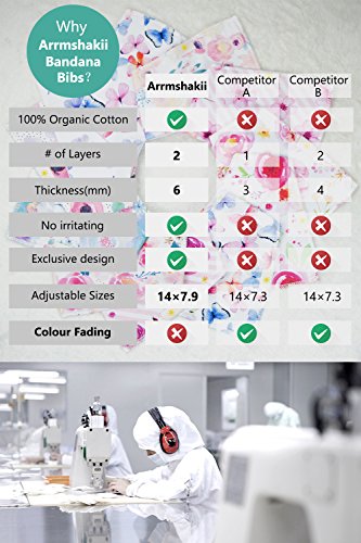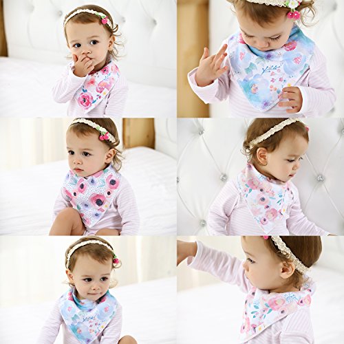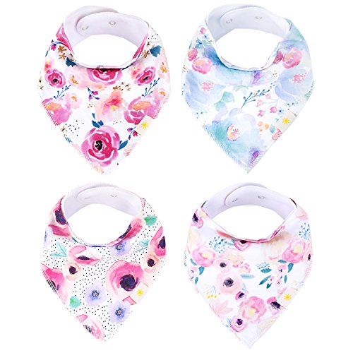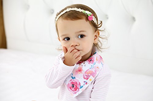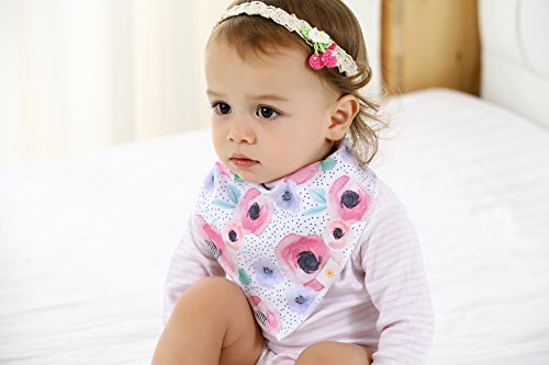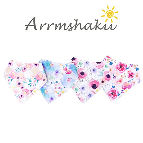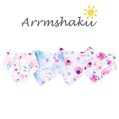 ? Set of 4 Baby Girl Bandana Bibs by Arrmshakii which are a stylish solution to your teething baby's constant drooling. ? We choose the 100% ORGANIC COTTON which has unique feature of strong absorbing moisture, soft and hypoallergenic. Help prevent baby's skin rashes from drool. ?2 Nickel-Free snaps closures to eliminate any risk of skin allergies, making the bibs easily adjustable (no Velcro), ensures perfect fit even as the baby grows from 0 to 24 months. Getting rid of the bibs with plastic that avoid dangerous and damage other pieces of clothing in the laundry. ? Experience Peace of Mind. Lead Free, Phthalate Free! ? LONG LASTING DESIGN. DOUBLE OVERLOCKED that can stand the wear and tear even after long uses. ?EYE-CATCHING AND INCREDIBLY USEFUL. Our design lover's Baby Bandana Drool Bibs for girls: - Keep your baby's clothes germ-free. - Have unique designs that are trendy and fashion-forward, show off your baby girls' style and get tons of compliments. They're versatile and are the perfect finishing touch for any outfit. ?PERFECT GIFT IDEA - Whether you want to buy this as a gift for a new parents or as something special for your baby, you won't be disappointed. ?Only company that offers an IRON-CLAD 100% MONEY BACK SATISFACTION GUARANTEE... If you are not COMPLETELY SATISFIED, return them for a FUll REFUND!