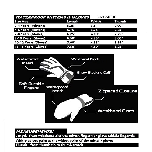 - The Mittens are for 2-6 years toddlers and kids, use wide zippered opening plus adjustable VELCRO wristband on mittens for easy on off but tight staying on. 3D tailored design with pre-curved fit and texture PU palm for non-slip handy grip and durable To avoid clipping skin when zip on the mittens we specially added the anti- clip guard piece under the zipper And added the safe elastic band and chain clips for anti-drop and anti-lost - The Gloves are for 7-15 years kids and youth, use VELCRO wristband cinch plush snow blocking cuff on the gloves for the elder ones to allow them maximum use their fingers Also have PU palm for non-slip handy grip and durable. Added the safe elastic band and chain clips for anti-drop and anti-lost No matter go for skiing, sledding, snowboarding, biking or snow playing, running in the back yard, it's is a great choice for your children. NOT like Distributor or Retailer, we Produce what we Sell. So be sure your money is well spent! Contact us if you have any issue when received the Gloves/ Mittens, we'll fix it for you immdiately, thank you! 0