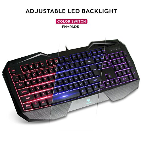 -. Feature : ANTI-GHOSTING 104 KEYS - Allows multiple keys to work simultaneously. Let you enjoy games with fast response. Laser carving characters, cool backlight feature. Lock/unlock function for WIN key to avoid distraction in games. Multimedia keys combinations. / UPGRADED LED BACKLIGHT - Three color LED backlight to make it convenient for usage at night and it is energy saving. The LED brightness could be adjusted in 4 levels for each color. / ERGONOMIC DESIGN / PALM AND WRIST REST - Ergonomic gaming design for maximum comfort and slickness. Delicate appearance, large comfortable palm rest, effectively reduce hand fatigue. / ULTRA SLIM FULL SIZE KEYBOARD / REMOVABLE KEY CAPS - Ultra-thin keyboard, compact and responsive, excellent hand feel. Space-Saving Design, luxury and modern appearance. The included key cap puller makes cleaning or changing key caps easier. / SPILL WATER & DUST PROOF - Spill Water-resistant with five drain holes designed at the bottom of keyboard. / EASY TO OPERATE - USB wired cable, plug and play, no driver needed. Anti-skid and waterproof design. Laser carving characters, non-slip design, splash proof and durable. Compatible with Windows/Android/Mac.