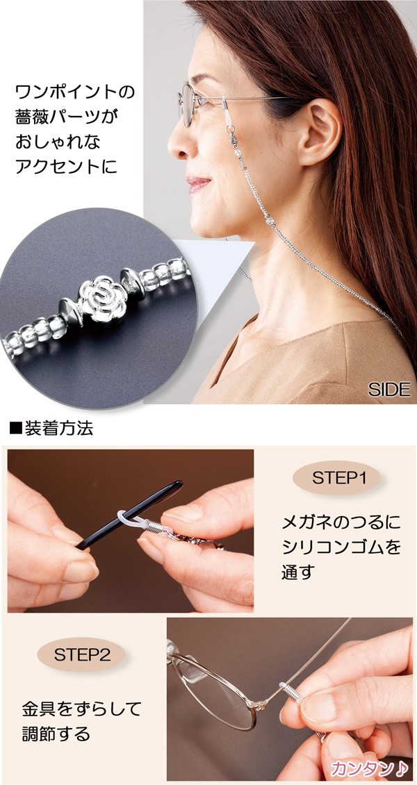 | アクセサリー感覚でつけられるビーズのメガネチェーン。サイドにくる薔薇のワンポイントがアクセントの上品なデザイン。いつものメガネや老眼鏡が一気にオシャレに!メガネをケースにしまう手間が省け、置き忘れ防止にもなります。メガネのつるにシリコンゴムを通すだけで簡単に装着できます。シリコンゴムを外して金具同士をつなぐとネックレスやブレスレットとしても使えます。 |