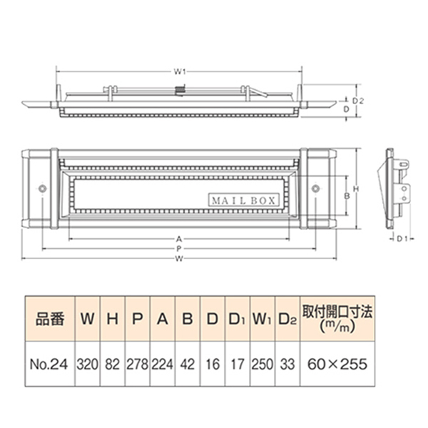 ●スペック:幅(mm)320 高さ(mm)82 取付開口寸法255×60mm