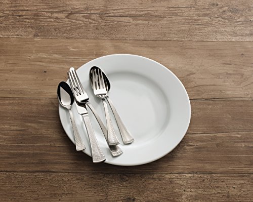 - 65-piece set with service for 12 includes 12 each of salad forks, dinner forks, dinner knives, dinner spoons, and teaspoons with a 5-piece serving set that includes a tablespoon, cold meat fork, pierced tablespoon, sugar spoon, and butter knife