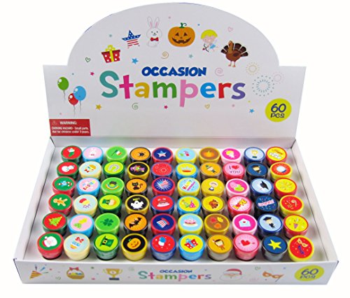 This self-inking stamp set has 60 DIFFERENT stamp designs that includes all the following holidays and occasions; Valentine's Day, St. Patrick's Day, Easter, Graduation, July 4th, Halloween, Thanksgiving, Christmas, New Years, Birthday Celebration. Our stamps are non-toxic, lead-free have passed all CPSIA and ASTM testing. Safe for children to use. Each stamp is shrink-wrapped and measures 1.5 inches tall, 1 inch in diameterFeature