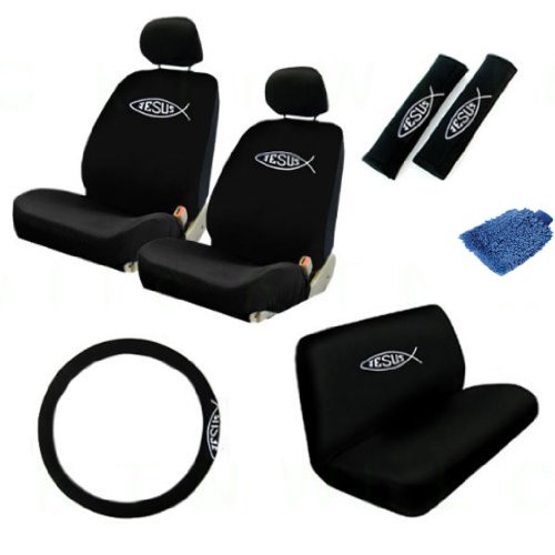 This Complete Auto Interior Gift Set includes 2 bucket seat covers, 4 headrest covers and 1 bench seat cover (with headrest) 1 top and 1 bottom and a steering wheel and shoulder pads.