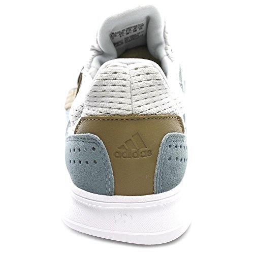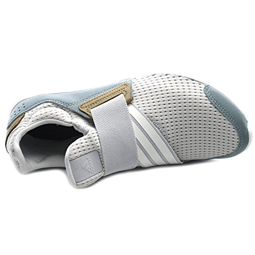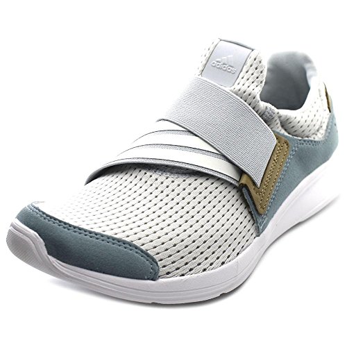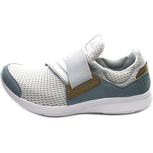 Slip-on running shoe with perforated upper featuring elasticized crisscross strap at vamp and logo patch on tongue