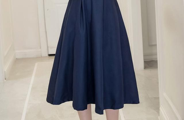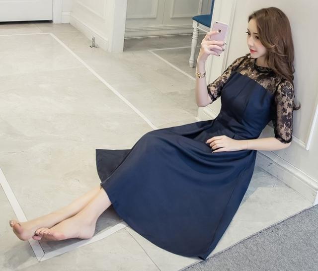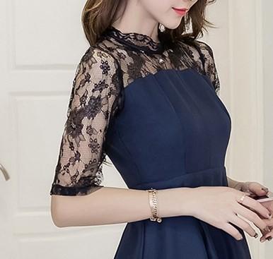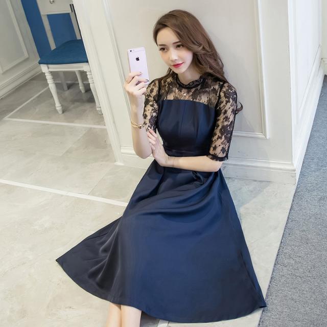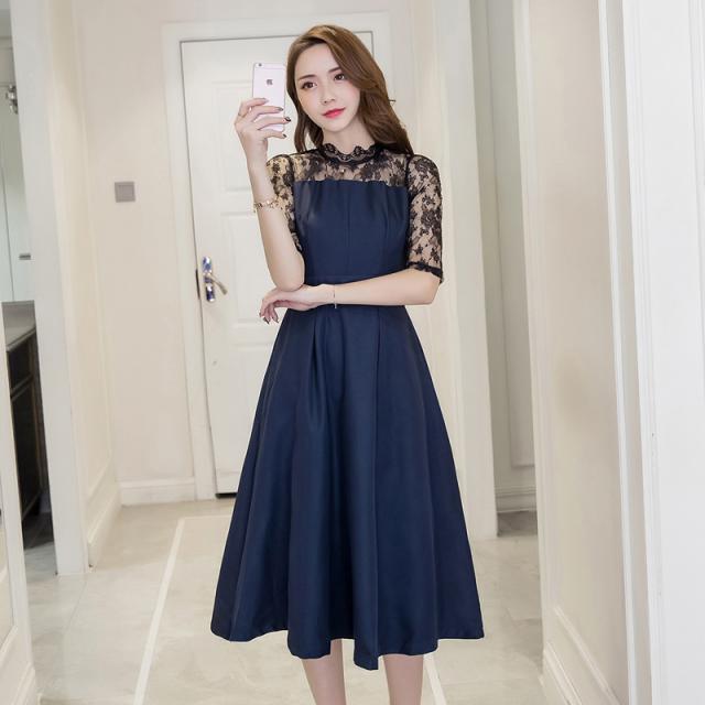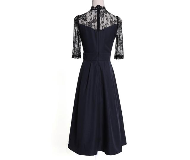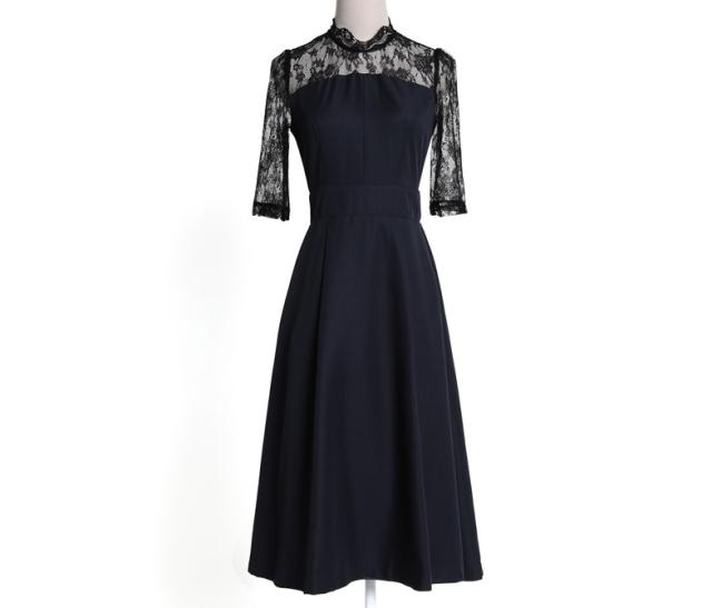 ドレス パーティードレス レース ハイネック 膝丈ドレス ミモレ丈ドレス ウエスト切り替え フレアドレス シンプル フォーマル 上品 清楚 大人可愛い ベーシック オールシーズン 結婚式 二次会 パーティー イベント セレモニー ディナー 海外 ノーブランド