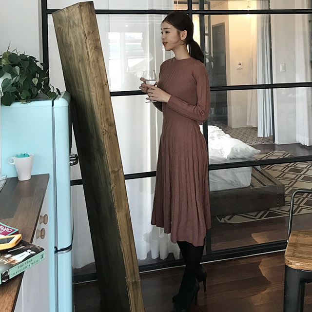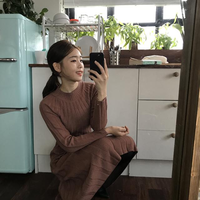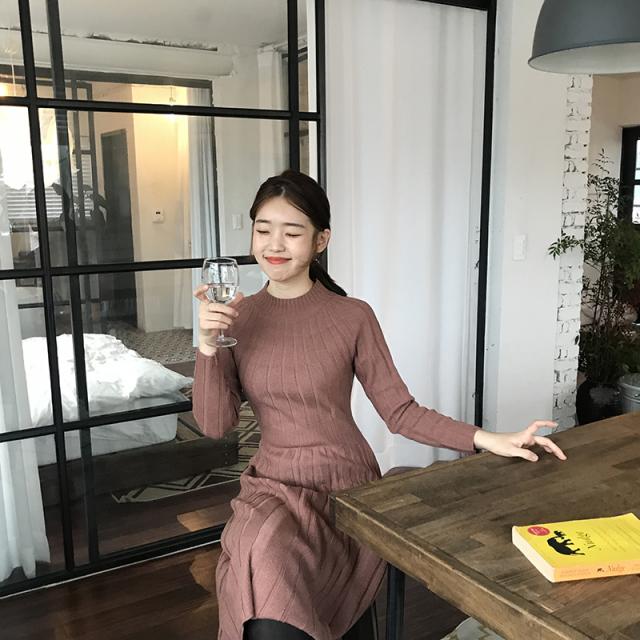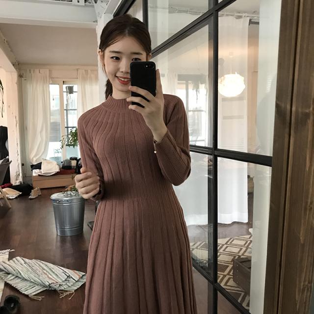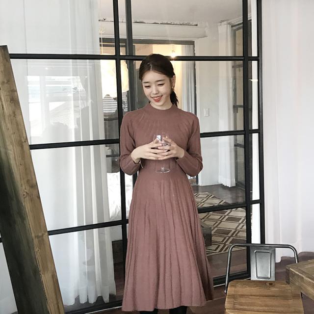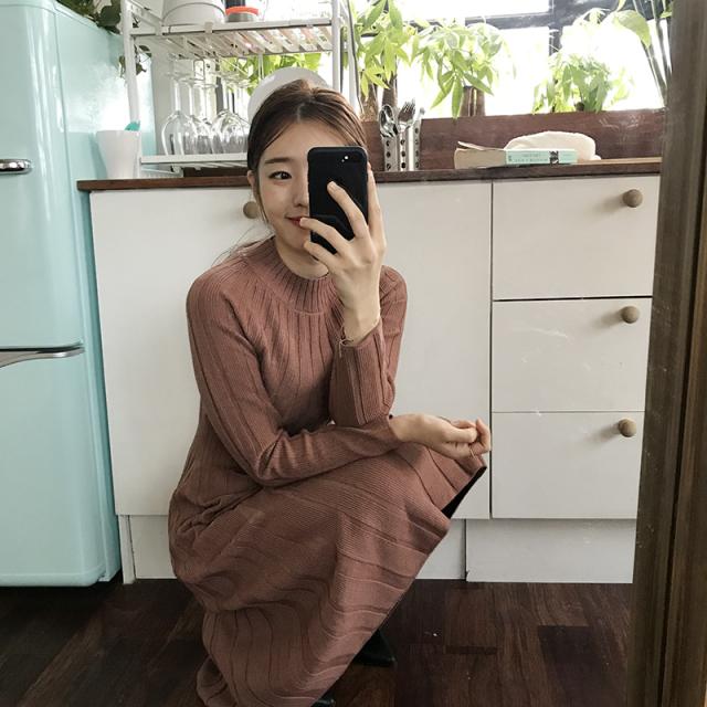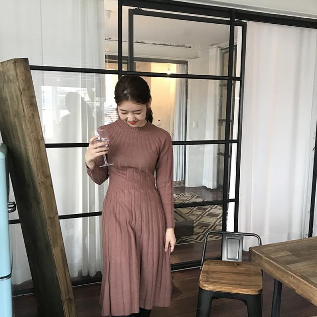 フレア 長袖 無地 ミディアム ハイネック カジュアルスタイル ニットワンピース