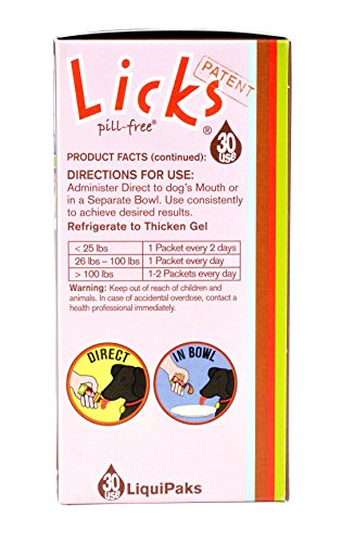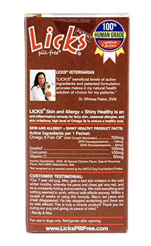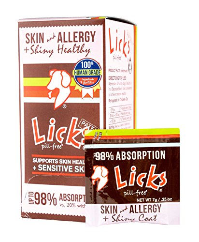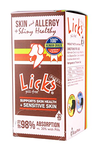 -. Feature : Strongest formulation on the market - packed with active ingredients that provide anti-inflammation for itchy skin, seasonal allergies, and skin irritations, keeping your dog feeling great with moisturized skin and a healthy coat. / Omega 3s moisturize from the inside out and providing hot spot relief for urgent issues and providing seasonal allergy relief / Pill-Free administration process allows for 98% absorption rate vs. 20% with pills and chews. In other words, LICKS is up to 10x's more effective than pills or chews! / Sourced and produced in the US, with Roasted Chicken Taste! Made with 100% real, all-natural chicken in facilities with ingredients for products meant for human consumption - 100% Human Grade. / Patented Ingredient formulation: Administer direct to mouth of dog or in a separate bowl; use consistently to achieve desired results.