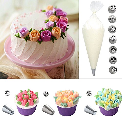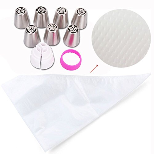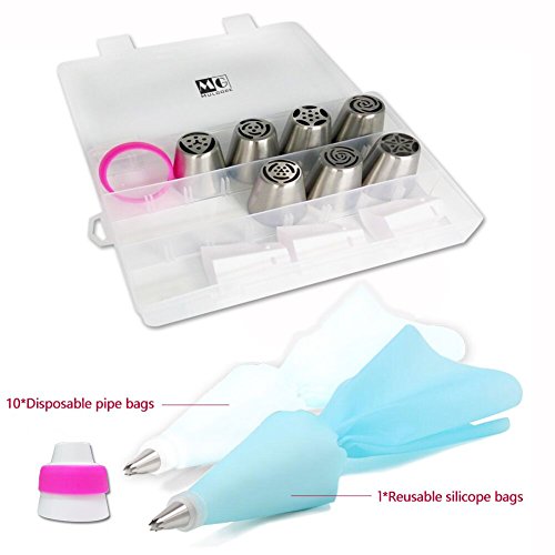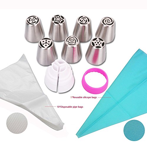 - Pipe Box: 7 PCS stain steel russian piping nozzles with 1 Tri-Color couplers, 10 disposable pipe bags, 1 reusable silicone bags and a storage case.