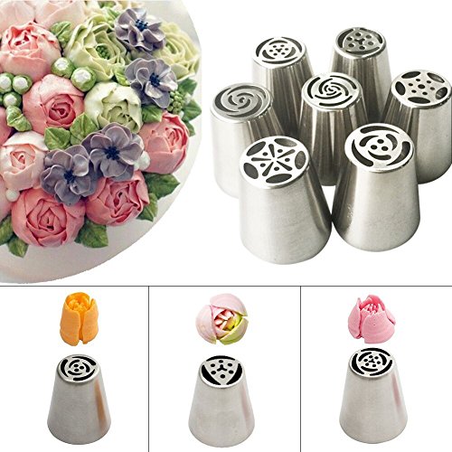 MULGORE Russian Piping Icing Piping Stainless Steel Large 7PCS Cake Piping Nozzles Icing Coupler Stainless Rose Nozzles