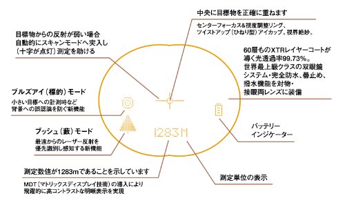 ■広範な視界、8倍率モデル■測定可能距離:10~1600m■最大表示可能距離:1760m■精度±1m以内■モード:SCAN、ブルズアイ(標的)ブッシュ(最速優先)、ハンティング(ARC機能)■躯体:完全防水、曇り止め機能、レインガード(撥水レンズ)、マトリックス・ディスプレイ技術(MDT)■三脚取付ネジ穴:○■望遠倍率:8倍■対物レンズ有効経:32mm■電源:CR123乾電池1本(付属)■重量:875g■メーカー保証:1年間