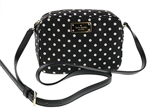 Kate Spade zip top shoulder bag Black and gold toned logo plate on front Interior features 1 slip pocket and 1 zip pocket Adjustable shoulder strap with maximum drop of approx. 21.5 inches Approx. dimensions: 7.75 in L x 5.75 in H x 2.75 in W