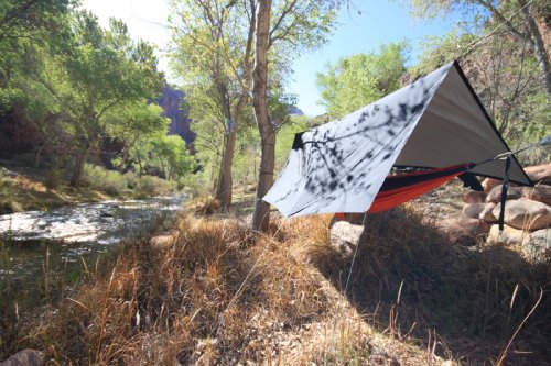 - Feature : Weighs only 2lbs and packs into its own carrying pouch for maximum portability. / Made of extremely durable polyester treated ripstop nylon. When you feel it in your hands you'll know why we call it the Strong Tarp! / Unlike many other tarps which have a plastic-like feel to them, the V9 Strong Tarp feels almost soft to the touch. Why? The V9 Strong Tarp is designed to minimize noise from wind and rain, helping you to sleep peacefully through the wind and rain. / Versatility: Multiple setup configurations allow you to setup the tarp in a number of different ways depending on your needs or the weather conditions. The tarp can also be used as a ground tarp, sun shade or shelter with or without your hammock. / A slightly reflective underside works to trap and reflect body heat on a cold night. Flip it over to keep the sun at bay when you need some shade.