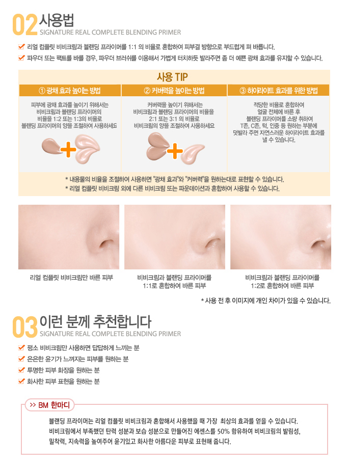 - 피부에 광채 효과를 높이기 위해서는 비비크림과 블랜딩 프라이머의 비율을 1:2 또는