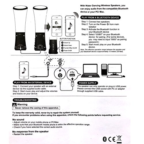-. Binding : Electronics -. Brand : KALANDO -. EAN : 0768390284331 -. Feature : Built-in rechargeable battery to truly wireless usage / Super-cool LED lights that magically dance up and down / Ultimate light show to favorite music / Suitable for PC, Mac, MP3 Players, Mobile Phones inc. iPhone & Tablets / With four buttons on the side: volume+,volume-, switch button to stop water dancing, power switch to shut down speaker -. Label : KALANDO -. Manufacturer : KALANDO -. Model : K302 -. MPN : ES768390284331302 -. PackageQuantity : 1 -. PartNumber : ES768390284331302 -. ProductGroup : Speakers -. ProductTypeName : PORTABLE_AUDIO -. Publisher : KALANDO -. Size : 6 ft -. Studio : KALANDO -. Title : KALANDO Wireless Bluetooth Dancing Water Fountain Speakers Light Show LED Speakers (6 Colored LED Lights, Built-in Rechargeable Battery, Bluetooth 4.0) -. UPC : 768390284331