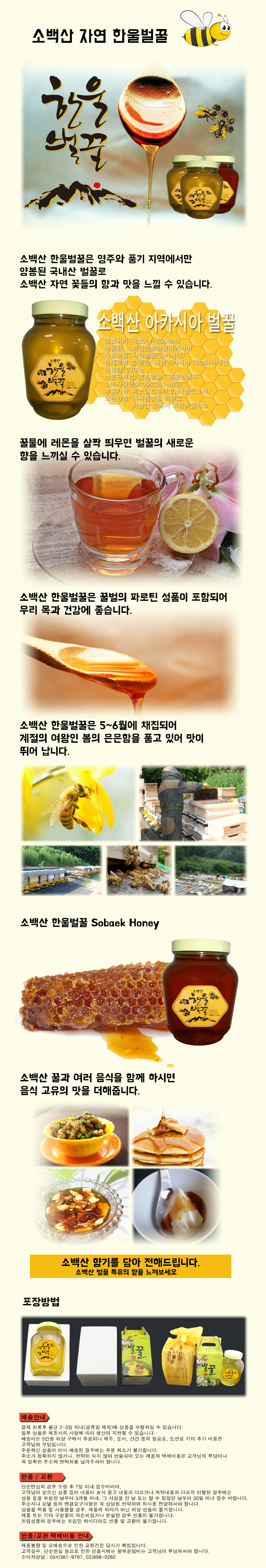 소백산 한울 벌꿀은 경북 영주와 풍기 소백산 자락에서 양봉된 국내산 벌꿀로 소백산 자연 꽃들의 향과 맛을 느낄 수 있으며, 소백산 벌꿀의 파로틴 성분이 포함되어있어 우리의 목과 건강에 좋습니다.소백산 한울 벌굴은 5-6월에 채집되어 계절의 여왕인 봄의 은은 함을 품고 있어 맛이 뛰어납니다.소백산 한울 벌꿀은 특히 백두대간 자락의 깊은숲의 야생꽃들의 향기를 느낄 수 있습니다.