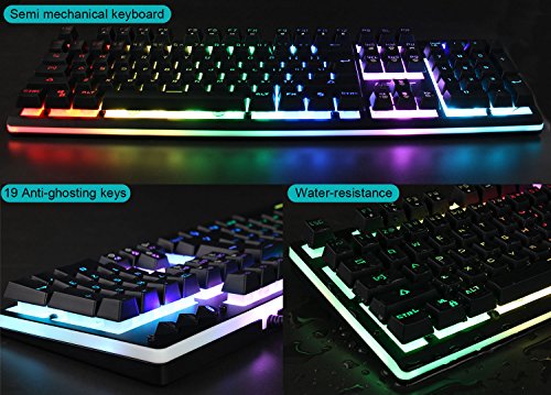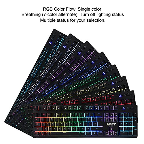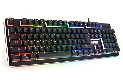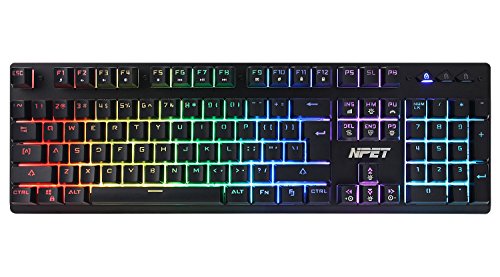 -. Feature : 【EXCELLENT MECHANICAL FEELING】This is not a real mechanical keyboard,but the keyboard closely matches the feel, travel, sound and efficiency of a full mechanical. Full keys is responsive amd comfortable, provide fast and sensitive feedback with soft touch experience / 【TOP QUALITY MATERIAL & ERGONOMIC DESIGN】 Keyboard adopts aluminum top cover, ABS botton cover and metal base, which keep the keyboard in place for better gaming or working experience. 2 stands on the back of keyboard can adjust the keyboard height / 【STABLE & RELIABLE PERFORMACE】 Wearproof braided wire, Gold-plated interface and Anti-interference magnet ring can to a large degree guarantees stable data transmitting. 19 anti ghosting keys, 13 multimedia keys. Flexible removable keycaps. Play and Plug / 【CUSTOMIZATION RGB BACKLIT ILLUMINATED】 A brilliant RGB light strip, choose your unique colors to match your setup, specific games or just to showcase your favorite colors. Low light leak around the keycaps means more light comes through the lettering, making each key more brilliant and easier to find in the dark / 【SUPER WATER-RESISTAND DESIGN】 With the help of drain hole under the bottom,the keyboard is as good as new. Full-size layout, 104 illuminated keys QWERTY computer / gaming keyboard. Support Systems: Compatible with Windows Vista/Win7/Win8/Win10, MAC, Linux, All NPET products bear full 24-month manufacturer's warranty