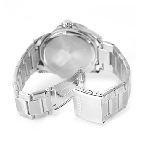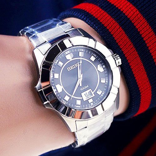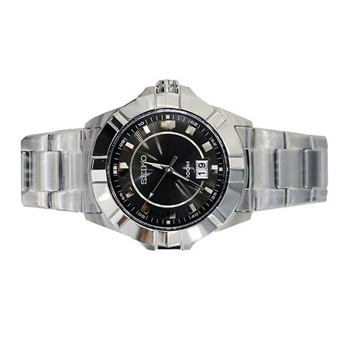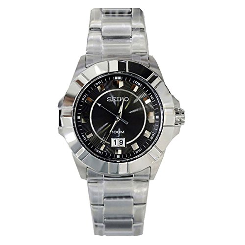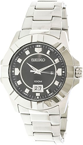 Stainless steel case with a stainless steel bracelet. Fixed stainless steel bezel. Black dial with silver-tone hands and index hour markers. Minute markers around the outer rim. Dial Type: Analog. Luminescent hands and markers. Date display at the 6 o'clock position. Quartz movement. Scratch resistant mineral crystal. Solid case back. Case diameter: 45 mm. Case thickness: 10 mm. Round case shape. Band width: 24 mm. Fold over clasp with push button release. Water resistant at 100 meters / 330 feet. Casual watch style. Seiko Lord Black Dial Stainless Steel Mens Watch SUR129.