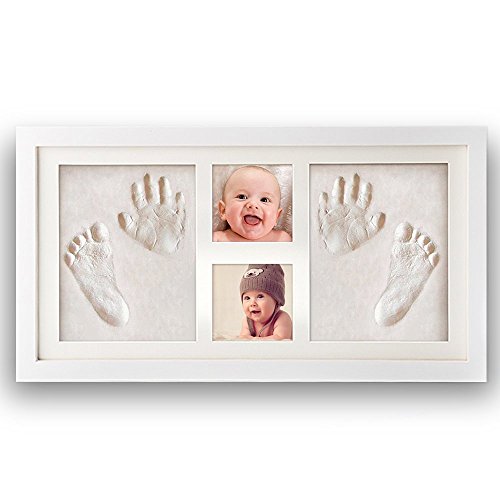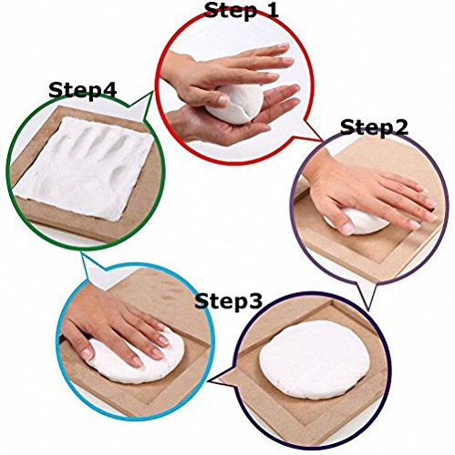 Babies grow and change so quickly, Capture The Moment Now! Your baby won't stay little forever, they grow mush faster than we imagine. Maintain your beautiful memories by capturing their precious hand and footprint with our kits. Let the valuable moment satys forever! How to Use: Step 1: Remove the clay from its packaging, and knead for 3 to 5 minutes until it is soft. Insert the soft clay into the large section of the frame, and use a rolling pin or mug to create a smooth and flat surface. Step 2: Press your baby's hand and foot into the clay to make a hand and footprint. Step 3: Prepare two small pictures ( 7.5*7.5 cm) to fit inside the frame cut-outs, and stick the pictures on top of the frame. Then, remove the front and back protection from the acrylic glass piece. Place the acrylic glass on top of the white frame silhouette, and place the frame together. Now you're ready to enjoy a wonderful keepsake that will bring a smile to your face every time you see it! Note: Applying a small amount of baby skin cream can prevent drying your baby's delicate skin. Make sure to wash your baby's hand and foot right after using. Please allow 48 hours for the clay to fully dry. Warning: This product should be used ONLY under direct supervision of an adult.