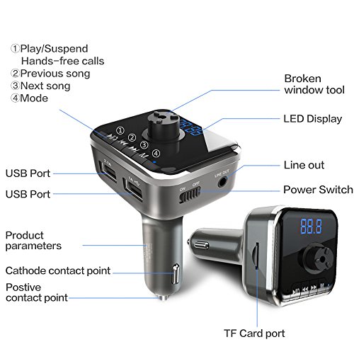 Multi-purpose and multi-function: The Bluetooth fm transmitter with window breaker, supporting 2 USB car charging, hands-free calls, data transmission by TF card and car battery voltage detection display