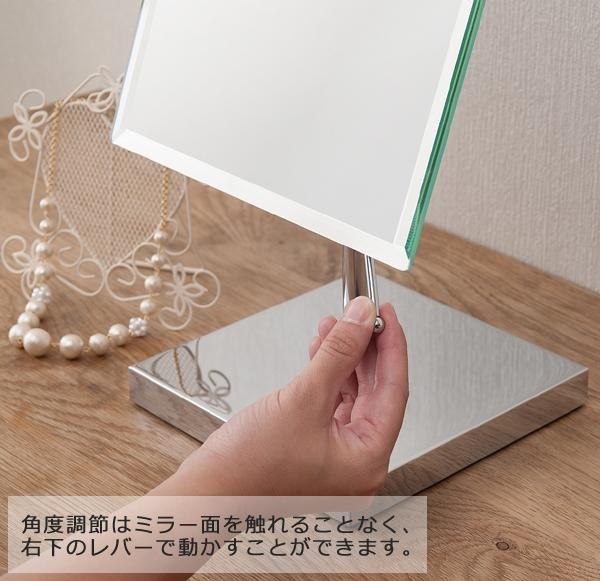 ミラー面が大きくお顔はもちろん、デコルテまで映るので、メイク・ヘアセット・アクセサリー小物を合わせるなど全体のバランスをチェックできます。角度調節はミラー面を触れることなく、右下のレバーで動かすことができます。 |