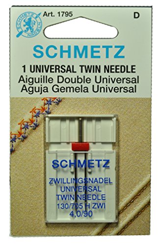 -. Feature : Schmetz Sewing Machine Twin Needle SCHMETZ TWIN NEEDLE 4.0/90 (1795) Description: Two Universal needles attached to a cross bar on asingle shaft allows for making two parallel rows ofstitching at the same time. Must be sused on a zigzag sewing machine. Create straight, zig zag ordecorative stiches. This space can vary form 1.6 upto 6mm between the two needles. Size: 4.0/90 1795 / Sewing Machine Twin Needle