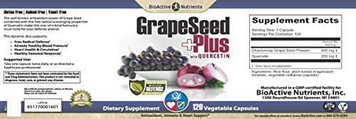 Studio : BioActive Nutrients Publisher : BioActive Nutrients Binding : Health and Beauty Product Description Grapes have been around for thousands of years and the healing properties of their vines, leaves, seeds, and wine are well known. Grape seed extract in particular is rich in antioxidants, those fabulous fighters of free radicals that help to protect us from cell damage. Research is ongoing on the links between grape seed extract and treatment for a variety of other issues, including varicose veins, poor circulation, and some skin problems. grape seed extract can be combined with quercetin' another powerful antioxidant found abundantly in onions, to concentrate and supersize the therapeutic powers of both. And the flavonoids found in both grapes and quercetin have been linked to something I think is basic to good health-fighting fungus. Anti-inflammatory, antimicrobial, and antioxidant supplement all in one bunch. 0