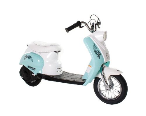 Look super stylish in this Surge 24V City Scooter! This retro-inspired scooter is decked out in true vintage fashion, featuring teal and white colors with black floral accents. Need some get-up-and-go? The 24V battery and twist grip throttle make it easy to reach a max speed of 15 mph, while the rear hand brake make it easy to come to a smooth stop. The padded contoured seat and the 12" pneumatic tires make this ride a smooth and comfortable one. Show off your vintage style with this adorable City Scooter!Feature