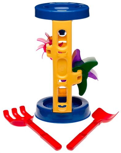 - Feature : 14 3/8" sand and water wheel / 11 1/4" shovel / 11 1/4" rake / 2 different wheels that spin in opposite direction / Sieve built into the base with funnel on top