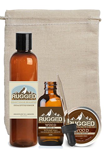 Rugged Evolution [Wood (Pine/Cedarwood Scented) - Medium Strength] Premium Beard Care Sample Set - Beard Shampoo, Balm & Oil - Facial Hair...