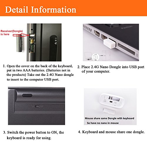Comfortable full-size keyboard, 2.4GHZ Wireless Connection. One Nano receiver connects both the mouse and keyboard to your computer. Just put it into your computer USB port and it will be ready for using.