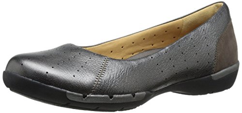 This Unstructured shoe is a joy to slip your foot into. Crafted from pewter metallic leather with luxe lambskin and suede linings, it features the innovative Air Circulation System, a unique climate control technology that keeps feet feeling fresh all day. A removable OrthoLite molded footbed, Clarks Plus intelligent underfoot cushioning, and lightweight EVA midsole with rubber outsoles add all day comfort. This easy to wear women's style has workplace polish and is a great choice for travel.Feature