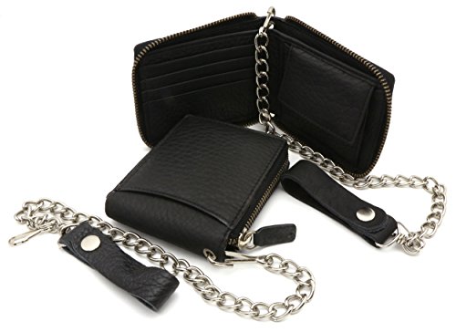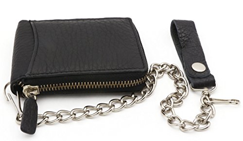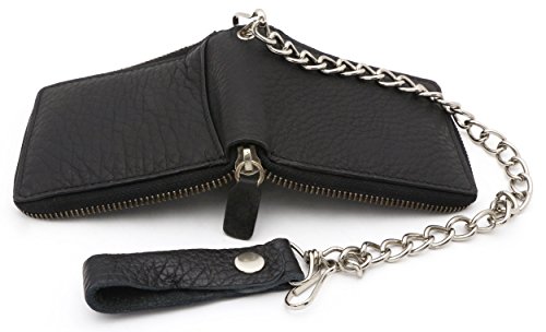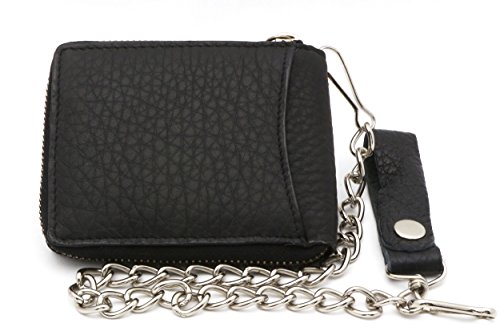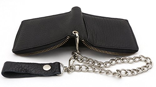 -. Title : Bifold Black Genuine Leather Scale Texture Zip-Around Wallet with a Chain