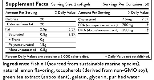 -. Feature : POTENT - 1,000 mg omega-3 fatty acids per serving (750 mg EPA and 250 mg DHA) in triglyceride (TG) form. / SUSTAINABLE - Certified by the Marine Stewardship Council. / PURE - Fish oil is sourced from wild deepwater fish off the coast of Norway. / QUALITY - Made in an NSF cGMP certified facility. Molecularly distilled for purity and potency. No sugar, gluten, dairy, or artificial additives. Third party quality tested. / BENEFICIAL - EPA helps to maintain healthy cholesterol levels and supports mood. DHA can support cognitive health and support brain and eye development.