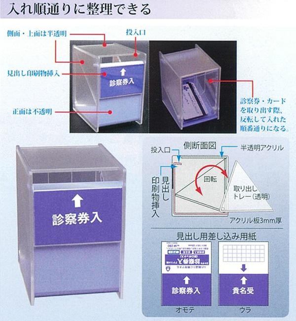fk094igrjs入れ順通りに整理できる便利な診察券入れです サイズ (約)本体サイズ:間口84×奥行116×高さ125mm、投入口サイズ:左右78×高さ10mm、取出口サイズ:高さ100×幅70mm 個装サイズ:9×13×12cm 重量 約300g 個装重量:370g 素材・材質 アクリル樹脂 仕様 見出し用差し込み用紙付 製造国 日本 受付窓口の必需品 入れ順通りに整理できる便利な診察券入れです
