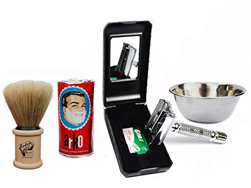 -. Feature : Baili ® Silver Plated Butterfly Double Edge Safety Razor shaving set Excellent balance for a close shave, designed for easy blade replacement, Uses all safety razor replacement blades / Arko Shaving Cream Soap - This soap lathers easily and quickly. It builds a very thick and lubricating lather, Fantastic, potent and longer lasting scent, Gives a close and smooth shave, leaves the skin very smooth and supple / Rodeo Shaving Brush - Hand made, made of best natural hair, pure bristle, wooden handle, excellent quality, wooden handle , 4 cm, hair 5 cm long. / Shaving Bowl - New stainless steel slim shaving bowl, durable and portable. / Spares - Ultra sharp stainless Baili ® spares.