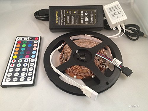 LED Type: 5050 SMD Color: RGB Protection class IP20 (Non Waterproof) LED quantity: 150 LED/16.4 ft Operating voltage: DC 12V Working Current: 2A/5 Meter Output power: 24W/5 Meter Viewing Angle: 120 ° Operating temperature: -20 to 50 ° Size: L500cm (5M) × W1.00cm x T0.25cm Source life: > 50,000 hours 12V 2A Power Supply: Input: 100-240V AC 50/60Hz Out put: 12V 3.0A Cable length: about 110cm US Plug 44 Key IR Remote Controller: Connection mode: Common Anode (+) Input: 12V Output: 12V Max load current:2A each color Working Temperature: -20°C-60°C Control box dimension: 50mm x34mm x22mm Remote controller dimension: 124mm x 56mm x 6mm Remote controller battery 3V: 1xCR2025 On: Turn on Power. Off: Power off. Up: increase brightness. Down: decrease brightness. R: change color to red. G: Switch to green color. B: change color to blue. FLASH:color changing automatically, quickly jump. STROBE: automatically change color, gentle jump. FADE: automatic color change, gradually move quickly. SMOOTH: automatic color change, gradually move smoothly. 8 Light Pattern: Quick / Slow / Auto / Flash / Fade7 / Fade3 / Jump7 / Jump3.Feature