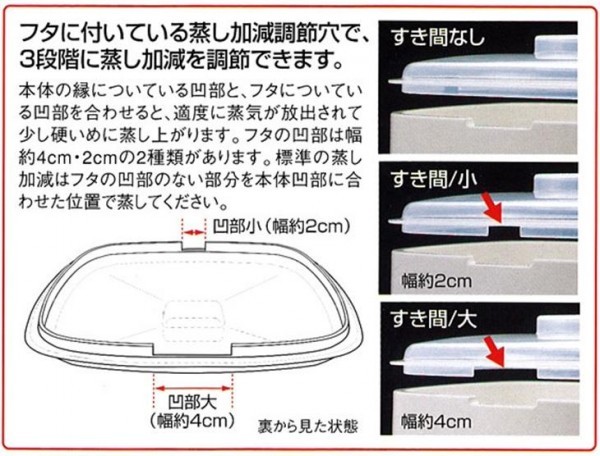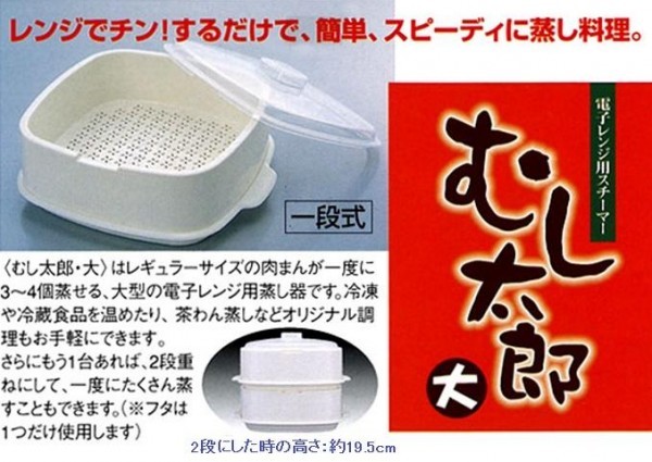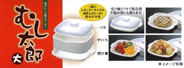 | 「むし太郎」は電子レンジ専用の蒸し器です。ちょっとおやつに肉まんを、残り物を温めたい時など、大きな蒸し器を出すまでもなく、手軽においしく電子レンジで蒸し上げます。レンジでチンするだけで冷凍食品などほっかほっかのおいしさに。蒸し加減調節穴つきなので、材料やお好みにあわせてお使い下さい。 |