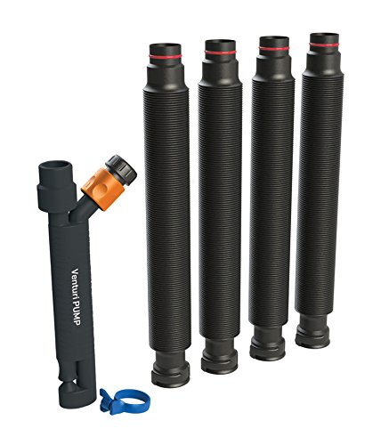 - No electricity needed; the innovative design uses water pressure from a garden hose to build suction