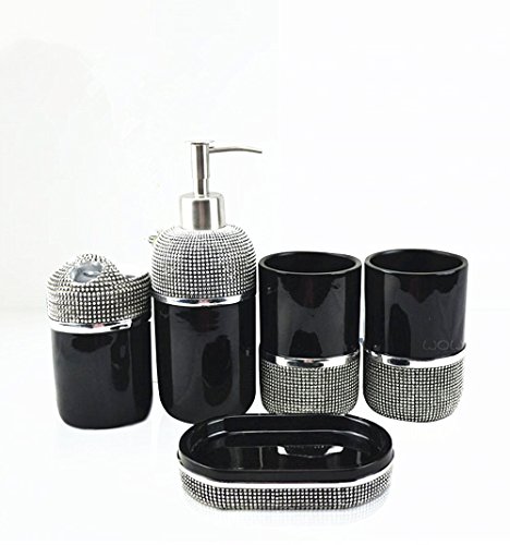Features 1 soap dish, 1 tumbler, 1 soap or lotion dispenser, and 1 toothbrush holder.