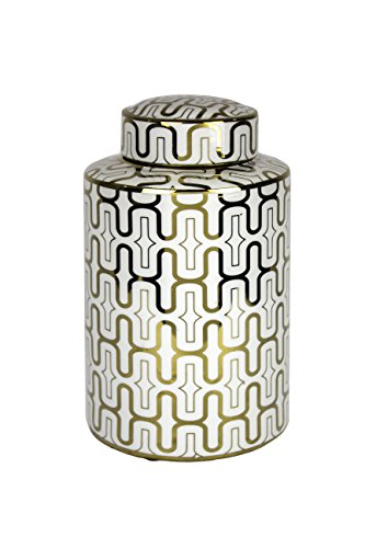 - Decorative Ceramic Covered Jar, White/Gold , 7" X 7" X 12"