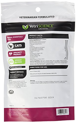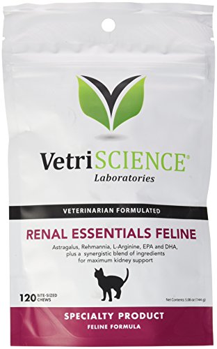 -. Binding : Misc. -. Brand : VetriScience Laboratories -. Department : cat-digestive-urinary -. EAN : 0026664266217 -. Feature : A bite sized chew for felines to support optimal kidney function / Includes adaptogens dmg and astragulus root powder to support immune system function and circulation in the kidney / Vitamin b antioxidants to support energy production and proper kidney function / Packaging May Vary -. Label : Vetri-Science Laboratories -. Manufacturer : Vetri-Science Laboratories -. Model : 0900662.120 -. MPN : 900662.12 -. NumberOfItems : 1 -. PackageQuantity : 1 -. PartNumber : 900662.12 -. ProductGroup : Pet Products -. ProductTypeName : PET_SUPPLIES -. Publisher : Vetri-Science Laboratories -. Size : 120 chews -. Studio : Vetri-Science Laboratories -. Title : VetriScience Laboratories Renal Essentials Feline Supplement for Pets, 5.08 oz -. UPC : 026664266217